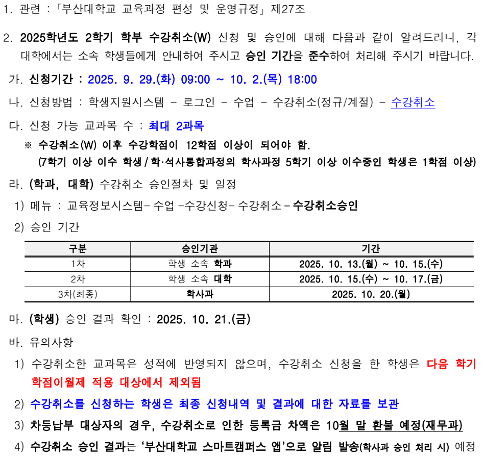 [2025학년도 2학기] 학부 수강취소(W) 안내