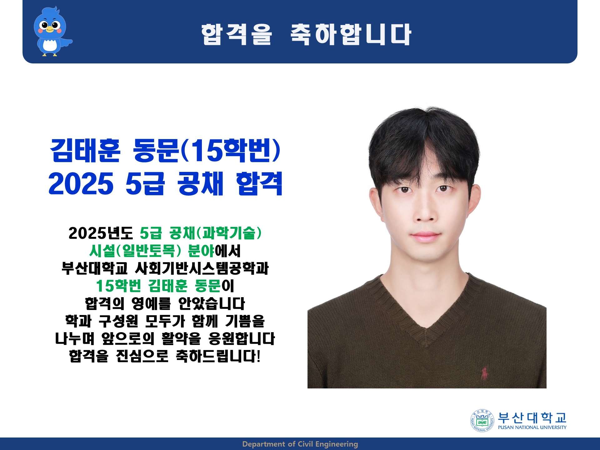 2025년도 5급 공채 시설(일반토목) 분야 합격(15학번 김태훈)