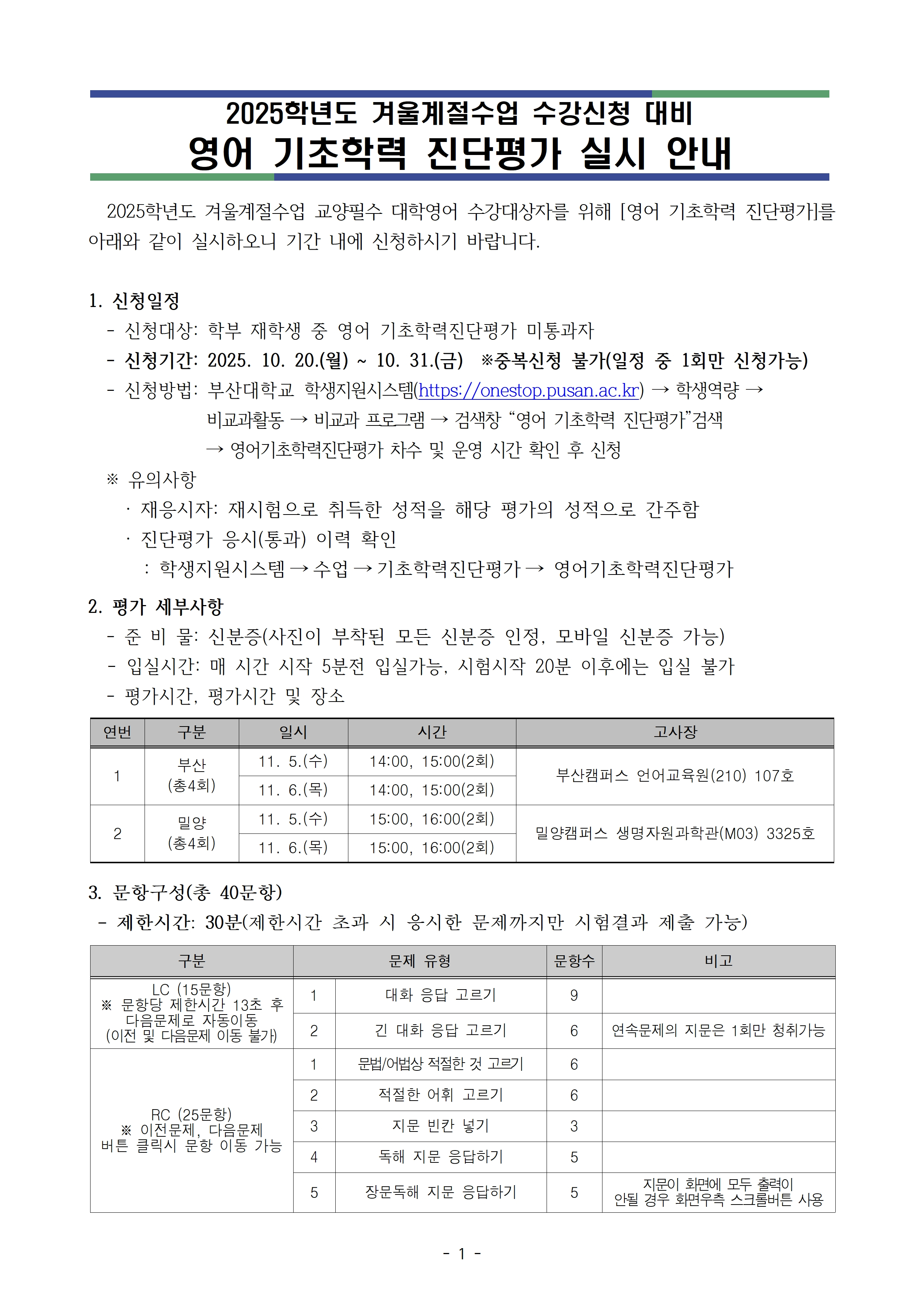 fnctId=bbs,fnctNo=3207 작성일 2025.10.13 수정일 2025.10.13 작성자 관리자 조회수 30 [2025학년도 겨울계절] 수강신청 대비 영어 기초 학력 진단평가 실시 안내 첨부파일 첨부파일이(가) 없습니다.