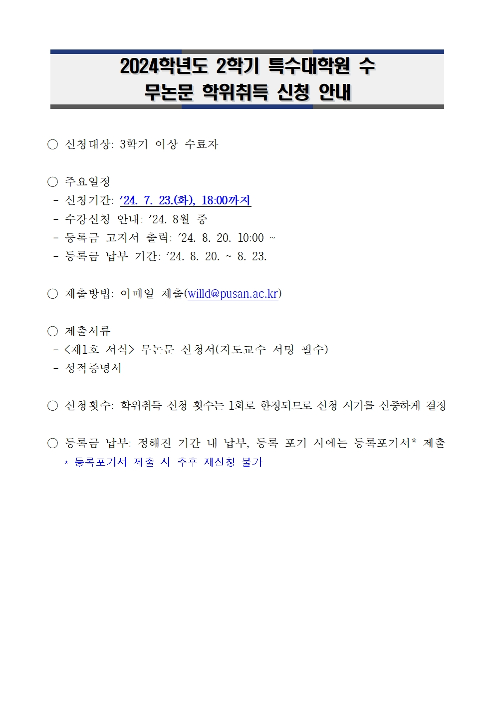 fnctId=bbs,fnctNo=3208 작성일 2024.07.19 수정일 2025.09.18 작성자 김지수 조회수 91 [2024-2학기] 특수대학원 무논문 학위취득 신청 안내 첨부파일 특수대학원 무논문 석사 학위취득을 위한 신청서(양식).hwp 미리보기